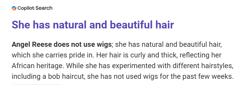 your looking at the video above and, confession, i’m a part of the problem. homegirl, you’ve got a serious head full of hair and, yes, i fact checked you on microsoft copilot, y’all laugh but if you have windows 10 and above, it’s not perfect, but i find it much more useful than ChatGPT. so straight up no chaser i asked microsoft copilot, “does angel reese have natural hair.” which may be true but those braids at the very top are suspect, i’m just trying to show you what she’s working with. if you didn’t get it… here’s the microsoft copilot reply.